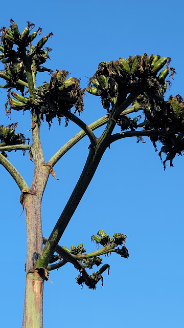 These plants end their life after 10 to 20 years with a spectacular show by producing a flower stalk 10 to 15 feet tall that draws a variety of bees.